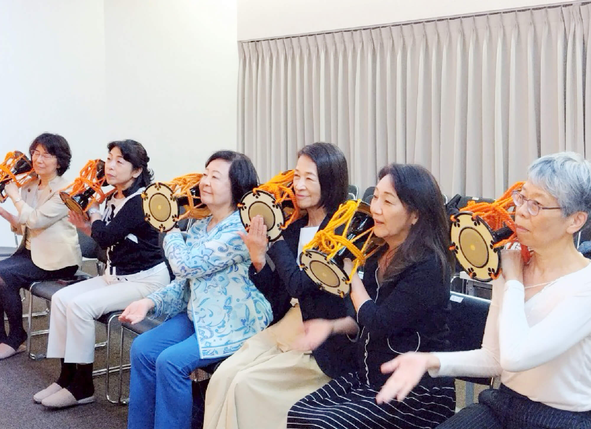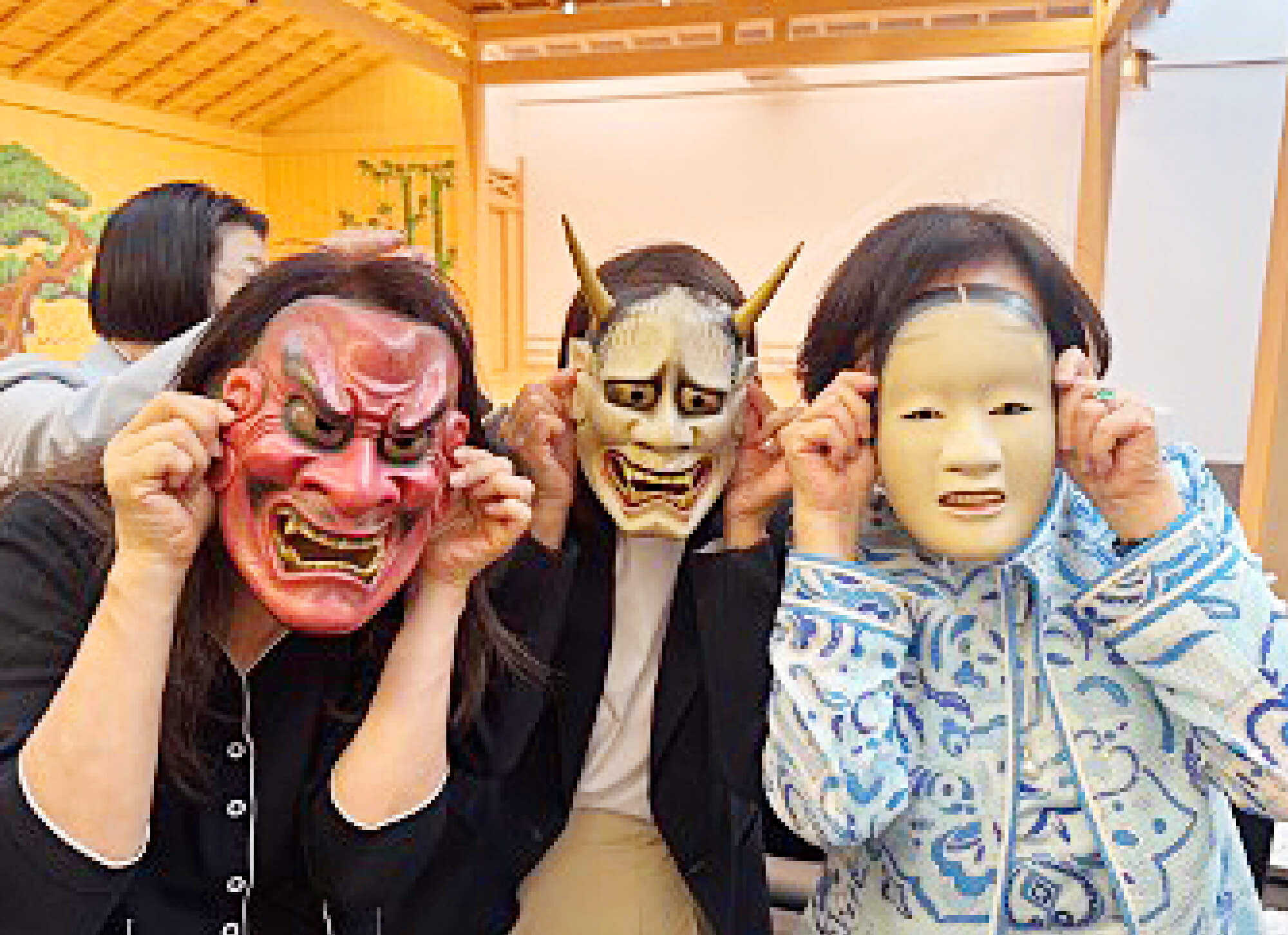 見学の最後は西宮能楽堂にてお能体験です。お能の歴史や鑑賞の所作などの解説を受けた後、実際に能面を着けたり、小鼓を叩いたりと、貴重な体験をさせていただきました。特に「小鼓は心に邪念があると良い音が出ない」との言葉に、参加者は皆、自然と背筋を伸ばし真剣な表情に。少しずつ音が整って行くにつれて、心が澄んで平らかになったように思います。
